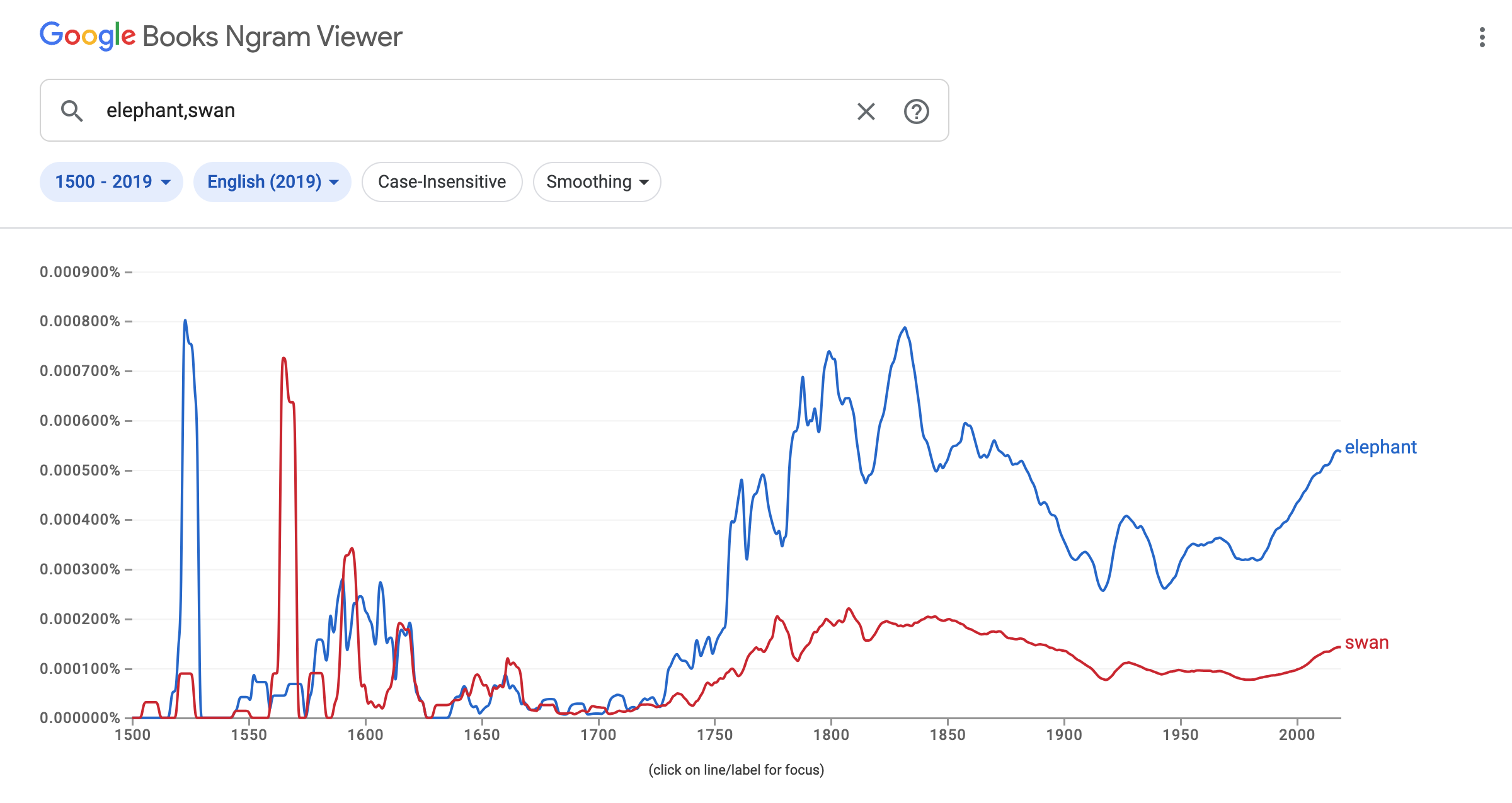 https://books.google.com/ngrams/graph?content=elephant%2Cswan&year_start=1500&year_end=2019&corpus=en-2019&smoothing=3