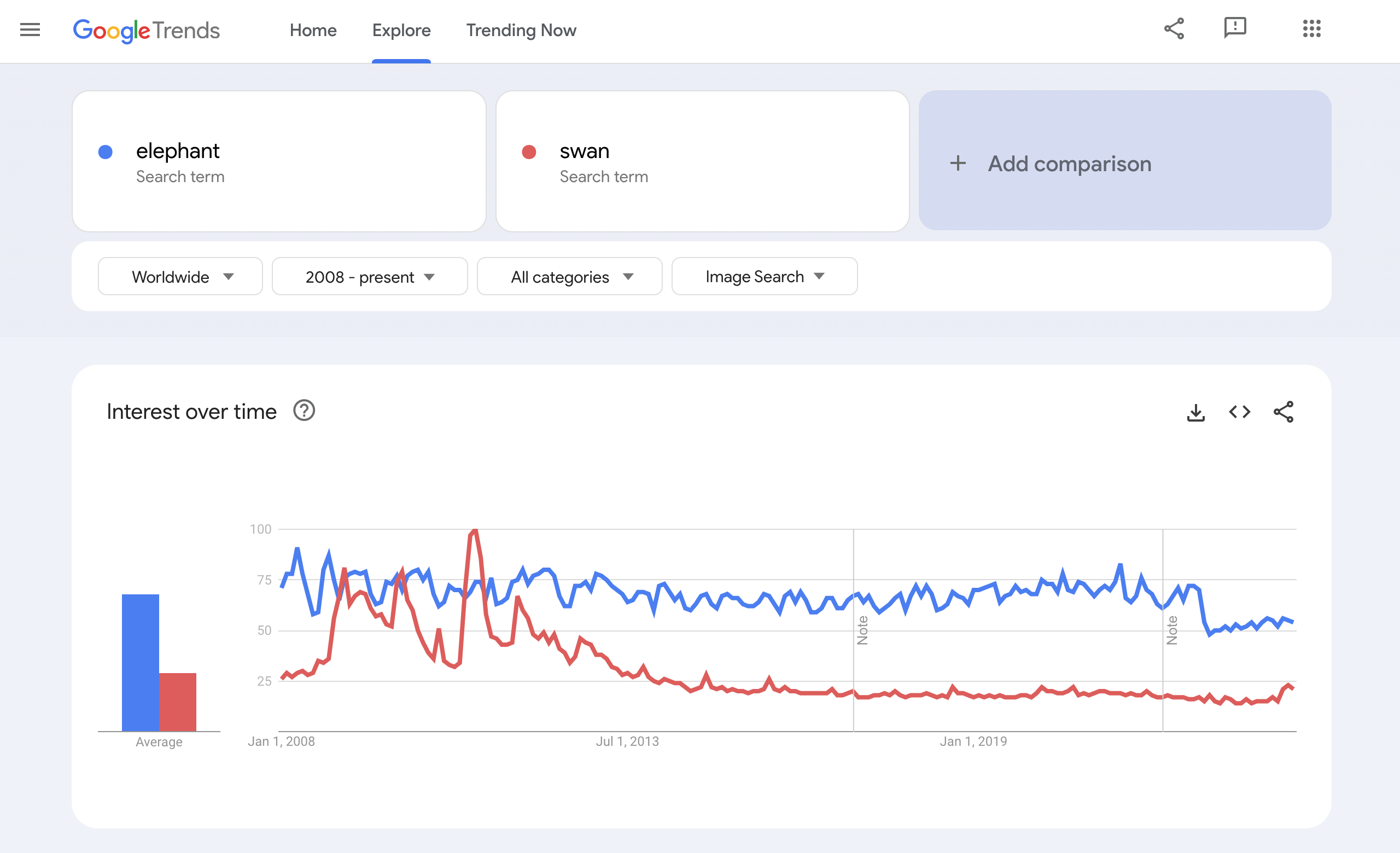 https://trends.google.com/trends/explore?date=all&q=elephant,swan